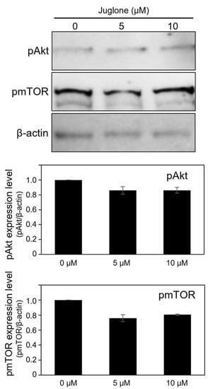 3.6. Juglone Reduces the Expression of Phospho-Akt and Phospho-mTOR Slightly