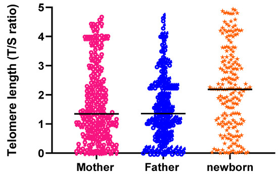 The longest TL was found in the newborns, overall in the mother–father–newborn triad. The above analysis was further confirmed by mothers with longer TL giving birth to a newborn with longer TL with a positive association, thus emphasizing fetal programming or repair of the telomere biology that may affect the health and lifespan of offspring [27].