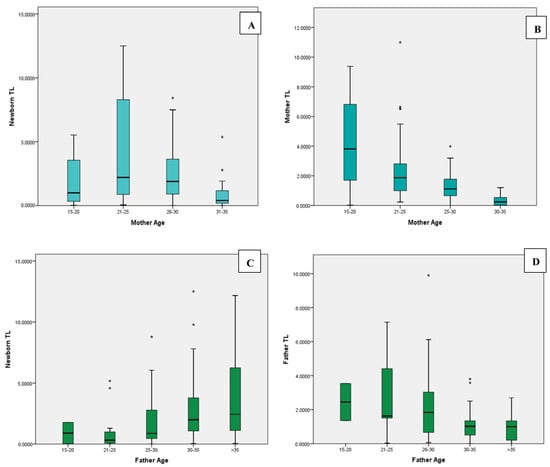Mothers with an age range of 21–25 showed the longest TL in newborns; whereas, fathers with age > 35 showed the longest TL in newborns, and this increased with an increase in the father’s age. On the other hand, in comparison to parents’ age and effect on TL, a decreasing pattern was seen with the increase in age (Figure 2A–D).