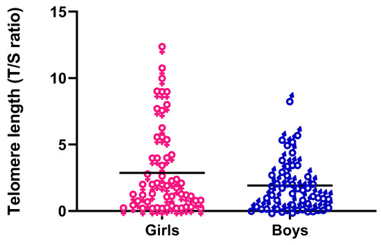Telomere length (TL) comparison between newborn girls and boys. Girls have longer TL than boys.