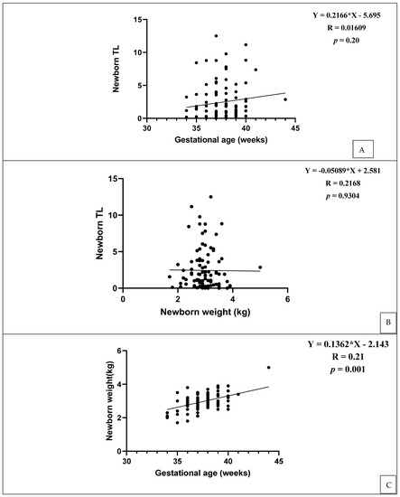 (A–C) Association between newborn telomere length (TL) and gestational age and birth weight. There was no association between newborn weight and gestational age, but there was a positive association between gestational age and newborn weight.