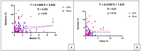 (A,B) Linear regression between mother and father TL among genders. No association was found between girls and boys with both parents.