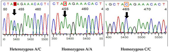 Sanger sequencing of TERT gene. Heterozygous genotype (AC) in both mothers and newborns but homozygous (AA, CC) in the father and newborns. The black arrow shows the SNP C/A allele at the restriction site rs2736100.