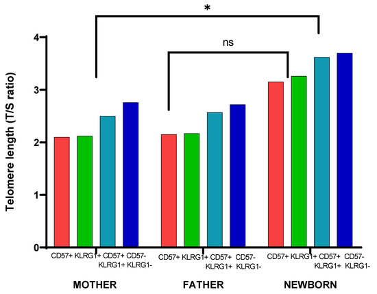 Comparison between telomere length and immune markers (CD57, KLRG1) in the triad: significant results (* p < 0.05) among mothers and newborns, whereas insignificant (p > 0.05) results between fathers and newborns. ns: not significant.