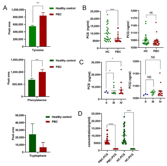 Aromatic amino acids and their metabolite end products PCS/PCG. (A) Differences in the peak areas of tyrosine, phenylalanine, and tryptophan between groups. (B) Concentration distribution of PCS and PCG between groups. (C) Distribution of PCS and PCG at different clinical stages of PBC. (D) Concentration distribution of PCS and PCG between groups. * p < 0.05, ** p < 0.01, and *** p < 0.001. NS: no significance.