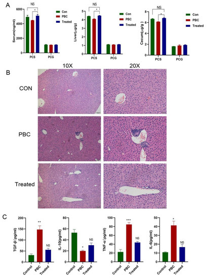 The effect of food-derived PCS on PBC mice. (A) A tyrosine-rich diet increased PCS concentrations in serum, liver, and cecum in PBC mice. (B) Liver inflammation in PBC mice was partially reduced by food-derived PCS. (C) Level of IL-6, IL-10, TNF-α, and TGF-β in serum from each group. PBC model group (n = 7), normal control group (n = 10), and PBC tyrosine treatment group (n = 8). * p < 0.05, ** p < 0.01, and *** p < 0.001. NS: no significance.