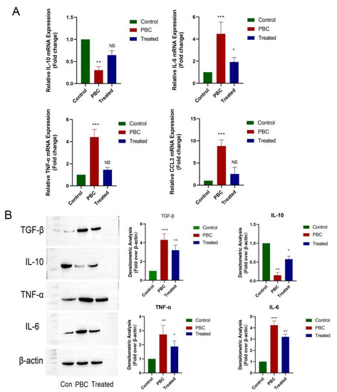 To confirm the reversal of liver inflammation in PCS-treated PBC mice, we detected mRNA levels of IL-6, TNF-α, IL-10, and CCL3 by PCR in liver tissue from each group of mice (Figure 4A), followed by confirmation of protein levels by western blot (Figure 4B). The results showed that both mRNA and protein levels of inflammatory cytokines were elevated in PBC mice along with decreased levels of anti-inflammatory cytokines, whereas the opposite trend was observed in PCS-treated mice, which was consistent with ELISA results.