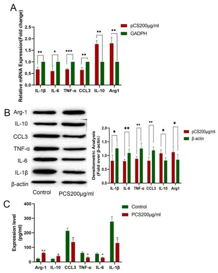 Kupffer cells are the first line of defense for liver immunity; however, the role of PCS on Kupffer cells remains unclear. PCS (200 μg/mL) supplementation to a culture of Kupffer cells for 8 h resulted in decreased mRNA levels of inflammatory cytokines (IL-1β, IL-6. TNF-α, CCL3) and elevated levels of anti-inflammatory cytokines (IL-10 and Arg-1) (Figure 5A), with similar changes in protein levels according to the western blot (Figure 5B). These results were subsequently confirmed by ELISA (Figure 5C).