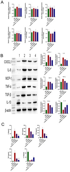 Total protein was extracted with RIPA (radio immunoprecipitation assay) lysate. The protein concentration was determined using a BCA protein assay kit (Thermo Fisher Scientific, Waltham, MA, USA) 50 μg of protein samples were subjected to SDS-PAGE and transferred onto PVDF membranes (Solarbio, Beijing, China). The membrane was blocked with 5% nonfat dry milk (Solarbio, Beijing, China) for 1.5 h, then incubated with specific primary antibodies at 4 °C overnight. Following incubation with HRP-conjugated secondary anti-rabbit antibody (7074, Cell Signaling Technology, Danvers, MA, USA), membranes were examined with ECL reagent (KF005, Affinity Biosciences, Melbourne, Australia) and visualized on ChemiDocTM XRS + Imaging System (BioRad, Hercules, CA, USA). ImageJ software (U.S. National Institute of Health, Bethesda, MD, USA), was applied to detect and analyze the gray values of protein bands on the membrane. The following primary antibodies: transforming growth factor (TGF)-β, interleukin (IL)-10, tumor necrosis factor (TNF)-α, interleukin(IL)-6, NADPH oxidase 2 (NOX2), P22, arginase-1 (Arg-1), C–C motif chemokine ligand 3 (CCL3), interleukin(IL)-1β, monocyte chemoattractant protein-1 (MCP-1), C–X3–C motif chemokine ligand 1 (CX3CL1), and β-actin. All the above antibodies purchased form Proteintech, Beijing, China.