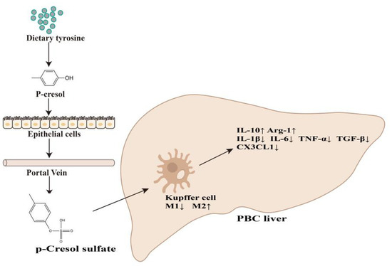 PBC-related intestinal flora changes, including reduced levels of protective metabolites and increased levels of damaging metabolites [5]. p-Cresol sulfate (PCS) and p-Cresyl glucuronide (PCG) are metabolites of Clostridium. Food and endogenous proteins and peptides are decomposed by digestive enzymes to form aromatic amino acids, such as tyrosine and phenylalanine, which are fermented by Clostridium, metabolized into PCS and PCG in the liver, and finally excreted through the urinary system [6]. PCS has long been recognized as a uremic toxin [7,8], however, there are few studies on the role of PCS in the liver.