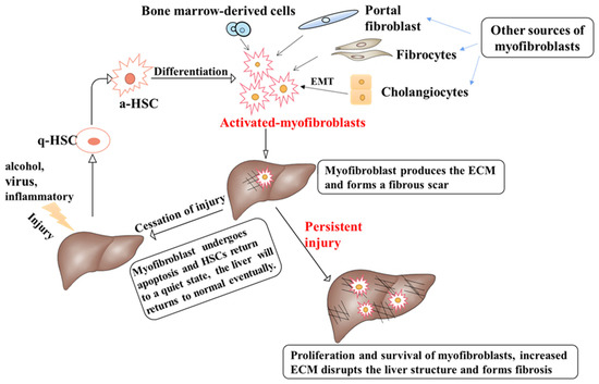 In numerous organs of the body, myofibroblasts are indispensable cellular factors in damage repair, but abnormal myofibroblast activation is a major pathogenic factor of fibrosis disease [5]. In liver fibrosis, activation and proliferation of myofibroblasts play an essential role because activated myofibroblasts are the major source of the extracellular matrix (ECM) [6]. Myofibroblasts accumulate at the site of injury and produce ECM. Hepatic fibrosis is the process of abnormal accumulation of ECM in the liver. If there is prolonged liver injury, hepatocytes will be replaced by abundant ECM. It has been reported that activation of HSCs is central to liver fibrosis, as activated HSCs (a-HSCs) are the main, but not the only, source of myofibroblasts.