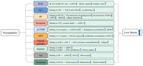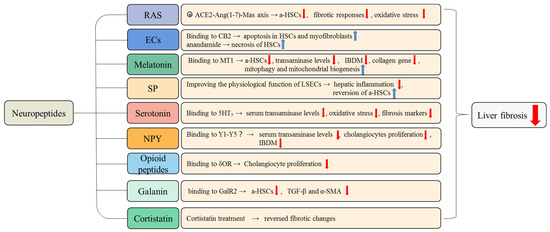 AANAT, N-acetyltransferase; ACE, angiotensin-converting enzyme; a-HSCs, activated hepatic stellate cells; Ang, angiotensin; AT1, angiotensin type 1 receptor; BDL, bile duct ligation; cAMP, cyclic adenosine 3′5′-monophosphate; CB, cannabinoids; CB1, cannabinoid receptor 1; CCL4, carbon tetrachloride; COX-2, cyclooxygenase-2; ECM, extracellular matrix; ECs, endocannabinoids; EMT, epithelial-mesenchymal transition; GalR, galanin receptor; HDC, histidine decarboxylase; HGF, hepatocyte growth factor; HR, Histamine receptor; HSCs, hepatic stellate cells; IBDM, intrahepatic bile duct mass; LSECs, liver sinusoidal endothelial cells; JNK, Junn-terminal protein kinase; MAPK, mitogen-activated protein kinase; Mdr2−/−, multidrug resistance gene 2 knockout; MMPs, matrix metalloproteinases; MT, melatonin receptor; NK-1R, neurokinin-1 receptor; NOX, NADPH oxidase; NO, nitric oxide; NPY, neuropeptide Y; Nrf2, nuclear factor erythroid 2-related factor 2; OR, opioid receptors; PBC, primary biliary cirrhosis; PDGF, platelet-derived growth factor; PKC, protein kinase C; PSC, primary sclerosing cholangitis; q-HSCs, quiet HSCs; RAS, renin-angiotensin system; RORα, retinoic acid receptor-related orphan receptor-α; ROS, reactive oxygen species; Sct, secretin; SERT, serotonin transporter; SP, substance P; SR, secretin receptor; TGF-β, transforming growth factor; TIMPs, tissue inhibitors of metalloproteinases; Y1, neuropeptide Y receptor 1; α-CGRP, α-calcitonin gene-related peptide; α-SMA, α-smooth muscle actin; 5-HT, 5-hydroxytryptamine; 5-HT1, 5-hydroxytryptamine receptor families 1.