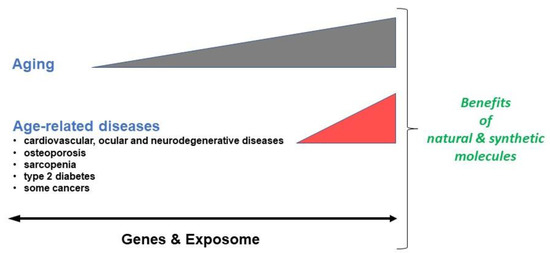 Aging is a process associated with life. It takes place at a variable rate in adults, and it is possible to distinguish chronological aging from physiological aging [1]. Physiological aging is the result of the involvement not only of intrinsic factors (genetic factors) but also extrinsic factors that vary from one individual to another [2,3]. In this context, the multifactorial role of the exposome, including environmental factors but also lifestyles and life events, is preponderant [4] (Figure 1). Consequently, defining a universal method to attenuate or prevent physiological aging, which can lead to pathological aging when associated with age-related diseases (cardiovascular, neurodegenerative and ocular diseases, osteoporosis, sarcopenia, type 2 diabetes and certain cancers) [5], is therefore a difficult challenge. It is nevertheless a major issue due to the increase in lifespan, and preventing aging, mainly pathological aging, is both a social and economic necessity [6].