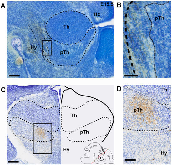 RFP+ fibers in the prethalamus at E15.5 and E16.5. (A,B) A sagittal section at E15.5 showing the presence of DAB-stained RFP+ fibers in the pTh and absence of RFP+ fibers in the thalamus at this age. Counterstained with thionin. Finer dotted line outlines RFP+ fibers. (C,D) Coronal section of an E16.5 mouse brain with inset, respectively, showing presence of DAB-stained RFP+ fibers in the pTh and absence of RFP+ fibers in the thalamus at this age. Counterstained with thionin. Inset in (C) indicating the rostro-caudal level and angle of the coronal slice with the red line. Scale bars: (A) = 100 µm, (B) = 50 µm, (C) = 250 µm, (D) = 100 µm. Hy = hypothalamus, Th = thalamus, pTh = prethalamus.