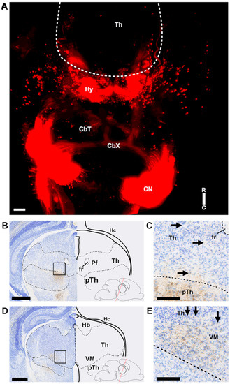 Cerebello-cerebral connectivity is known to be involved in motor activity, but several non-motor functions are also controlled by long-range cerebellar and cerebral projection neurons [1,2,3,4,5]. The most direct route from the cerebellum to the cerebral cortex runs through the thalamic complex and it is this cerebello-thalamic tract (CbT) that has been implicated in a wide range of neurological conditions, such as rapid onset dystonia, epilepsy and autism spectrum disorder (ASD) [6,7,8,9]. Several of these pathologies have a developmental aspect, and thus put a focus on the ontogeny and maturation of the CbT. Imaging data from children with cerebellar lesions, which are at high-risk of developing ASD [10,11], revealed concomitant cerebral impairments that were suggested to be mediated by impairments of cerebello-thalamic connectivity. Despite recent technical advances that allow clinicians to investigate the developing cerebello-cerebral connectivity in very pre-term born children [12], it remains unknown from which age cerebellar axons reach the thalamic primordium and thus also from which age cerebellar abnormalities can influence thalamo-cortical development.