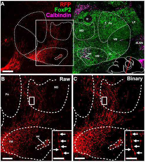 RFP+ fibers in the diencephalon at E18.5. (A) Coronal section of an E18.5 mouse brain stained for FoxP2 (in green), calbindin (magenta) and Red Fluorescent Protein (in red) showing an example of delineation of the ventromedial (VM), posterior (POm), mediodorsal (MD), ventrobasal (VB), ventrolateral (VL), lateral posterior (LP) and dorsal lateral geniculate (dLGN) nuclei, the fasciculus retroflexus (fr) and the mamillothalamic tract (mt). Bottom right shows a schematic showing the angle and rostro-caudal level of the coronal section. (B) Zoom in of boxed region in (A). In the inset, a single axon with multiple putative boutons is visible. Arrows indicate the putative boutons. (C) Binarized version of B after applying the threshold. Inset is a binarized version of the inset in C. Scale bars: (A) = 200 µm; (B,C) = 100 µm, insets = 25 µm.