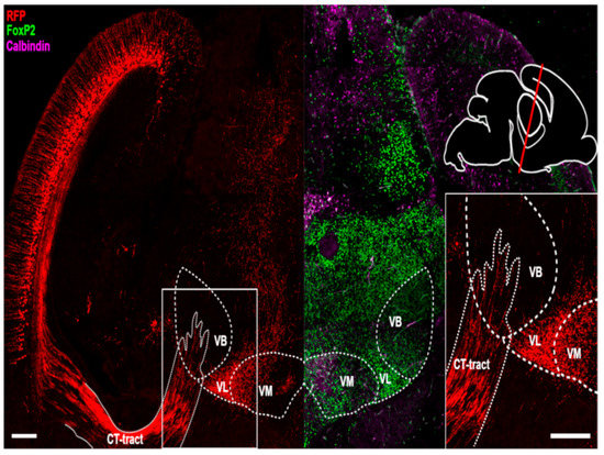 RFP+ cortical fibers entering the thalamus, specifically the ventrobasal thalamic nucleus, at E18.5. Coronal section of an E18.5 mouse brain stained for FoxP2 (in green), calbindin (magenta) and Red Fluorescent Protein (in red), with zoomed-in inset, showing the RFP+ corticothalamic fibers and another, separate, RFP+ fiber bundle, presumably originating from the cerebellar nuclei. Top right, schematic showing the angle and rostro-caudal level of the coronal slices. Scale bars: main image = 250 µm, inset = 100 µm. CT-tract = corticothalamic tract, VB = ventrobasal nucleus, VL = ventrolateral nucleus, VM = ventromedial nucleus.