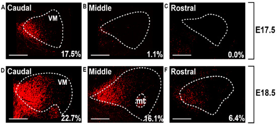 RFP+ fibers in embryonic thalamus of Ntsr1-Cre/AI14 mice progress rostral through the ventromedial nucleus. At three rostrocaudal levels the percentage of summed area occupied by above-threshold RFP-signal (pSAO) is reported for E17.5 (A–C) and E18.5 (D–F). Note that the indicated percentages are not equal to those reported in Figure 9 and Figure 10, since the latter represent the averages from bilateral VM of several sections.