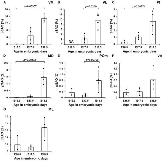 RFP signal quantification in the thalamic nuclei. Percentage of summed area occupied by above-threshold RFP-signal (pSAO). (A) VM (E16.5, n = 3, E17.5, n = 4, E18.5, n = 4), (B) VL (E16.5, n = 0, E17.5, n = 4, E18.5, n = 4) (C) Pf (E16.5, n = 3, E17.5, n = 5, E18.5, n = 4), (D) MD (E16.5, n = 2, E17.5, n = 5, E18.5, n = 4), (E) POm (E16.5, n = 3, E17.5, n = 5, E18.5, n = 4) (F) VB (E16.5, n = 3, E17.5, n = 5, E18.5, n = 4), (G) ML (E16.5, n = 3, E17.5, n = 5, E18.5, n = 4). Since the VL could not reliably be delineated at E16.5, as the border between VL and the intralaminar nuclei could not consistently be accurately delineated in all slices, we measured the pSAO in this nucleus at E17.5 and E18.5. Columns represent the mean; error bars represent ± SD; dots represent individual data points.