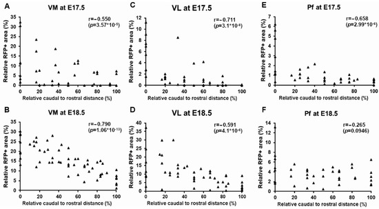 RFP signal quantification from caudal to rostral in the thalamic nuclei. The relative amount of RFP+ fibers (in %) is plotted against the relative rostral to caudal distance (in %) in VM, VL and Pf. (A,B) VM at E17.5 (n = 48) and E18.5 (n = 57), respectively, (C,D) VL at E 17.5 (n = 46) and E18.5 (n = 52), respectively, (E,F) Pf at E17.5 (n = 39) and E18.5 (n = 39), respectively. r = Spearman’s rho.