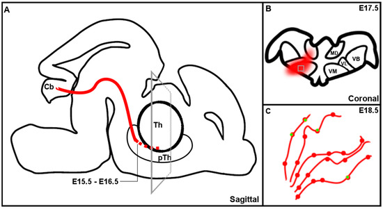 In the present study, we investigated the anatomical development of the CbT in mouse embryos aged E15.5–E18.5 (Figure 12) and found that prior to the entry of the thalamus, the CbT appears to stall its growth and reside in the prethalamus at least until E16.5. Several other thalamic afferents reveal such a ‘pause’ or waiting period, such as the trigeminal projection to the sensory VB nucleus [28] and CT pathways [19]. For the CbT this waiting period could come about due to several reasons: (i) to gain axonal energy supplies to allow axonal branching which could demand increased mitochondria production [29]; (ii) although most of the synaptic targets of CN axons are already born, CbT fiber invasion of the thalamus could be halted until the neuronal migration in the cerebellum nears completion [30] and (iii) CbT fibers, which originate from CN neurons born sequentially [15], might regroup in the prethalamus before entering the thalamic complex—a phenomenon described for the CT tract [24]. Furthermore, the mechanisms that facilitate the CbT waiting period remains to be elucidated. We hypothesize that the CbT is stalled temporarily by chemical signaling. Possible candidate signaling cascades are semaphorin-based, [31,33], albeit that numerous other molecules and receptors can potentially also influence the growth of CbT axons [34].