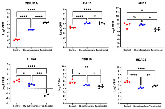 3.4.2. The Expression of Cell Cycle- and Apoptosis-Related Genes Is Altered upon Tucidinostat and DL-Sulforaphane Treatment
