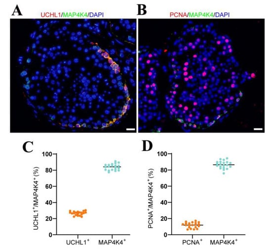The MAP4K4 expression in adult human testes was determined through double immunohistochemical staining. We revealed that MAP4K4 was expressed in the cytoplasm of spermatogonia along the basement membranes of seminiferous tubules in normal adult human testes (Figure 1A), and about 83.94% of MAP4K4-expressing cells were UCHL1-positive spermatogonia (Figure 1C). We analyzed scRNA-seq datasets GSE109037 (11 samples) and GSE120508 (12 samples) of human adult testes with normal spermatogenesis in order to better understand human SSCs. Applying “Seurat” in R to minimize data dimensionality, the cells were separated into 14 populations (Figure S1A,B). UMAP and clustering analyses of combined single-cell transcriptomic data from human testes were studied. Violin plots showed that MAP4K4 was highly expressed in spermatogonia, especially SSCs. Additionally, proliferating cell nuclear antigen (PCNA) was detectable in about 86.44% of MAP4K4-expressing cells (Figure 1B,D), indicating that MAP4K4 may contribute to cell proliferation in adult human testes. Together, these results suggest that MAP4K4 is predominantly expressed in proliferating human SSCs.