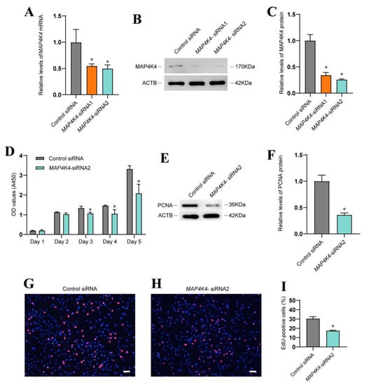 The influence of MAP4K4 knockdown on human SSC proliferation. (A) QPCR revealed MAP4K4 mRNA levels in a human SSC line after treatment with MAP4K4-siRNA1 and 2. (B,C) Western blotting showed MAP4K4 protein level changes in the human SSC line after the transfection of MAP4K4-siRNA1 and 2. ACTB was used as the loading control for the total protein. (D) CCK-8 assay illustrated the proliferation of human SSC line transfected with the control siRNA and MAP4K4-siRNA2. (E,F) The relative levels of PCNA protein in human SSC line after transfection with the control siRNA and MAP4K4-siRNA2. (G–I) The percentages of EdU-positive cells in human SSC line transfected with control siRNA and MAP4K4-siRNA2. Scale bars in G: 50 μm. * denote p < 0.05.