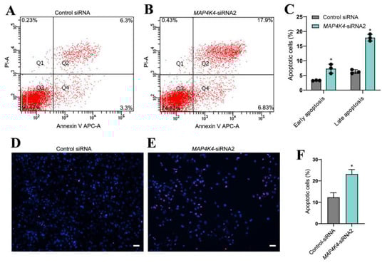 Since MAP4K4 knockdown increased cell debris in cultured cells, the significance of MAP4K4 in the regulation of human SSC apoptosis was investigated utilizing annexin V/propidium iodide (PI) labeling and flow cytometry. Compared to the control siRNA, the early and late apoptotic rates of human SSC line were both significantly enhanced by MAP4K4 knockdown (Figure 3A–C). A TUNEL assay showed that MAP4K4-siRNA2 increased the percentages of TUNEL-positive cells when compared with the control siRNA (12.34% ± 2.10 vs. 23.18% ± 2.12, p < 0.05) (Figure 3D–F). Considered together, these data indicate that MAP4K4 knockdown enhances the apoptosis of human SSCs.
