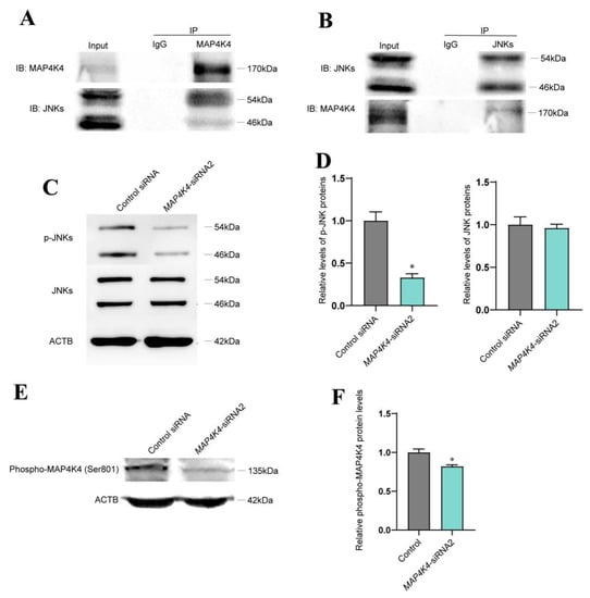 It has been reported that JNK phosphorylation is mediated by MAP4K4 [,]. To elucidate whether MAP4K4 interacts with JNKs, immunoprecipitation (IP) and Western blots were performed. Our Co-IP assay indicated that MAP4K4 could bind to JNKs (Figure 4A) and that JNKs were able to pull down MAP4K4 (Figure 4B). Expression levels of phosphorylated JNKs were detected using Western blots in the human SSC line after transfection with MAP4K4-siRNA2. We found that the phosphorylated JNKs levels were significantly decreased by MAP4K4-siRNA2 (Figure 4C,D). It has been shown that MAP4K4 phosphorylation at Ser801 is a highly conserved location [], and we revealed that the level of MAP4K4 phosphorylation at Ser801 was decreased in the human SSC line after MAP4K4 knockdown (Figure 4E,F).