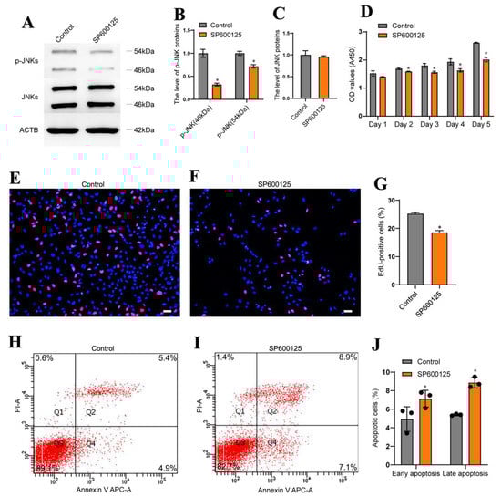 We next explored whether MAP4K4 regulated the proliferation and apoptosis of the human SSC line via JNK phosphorylation. To test this hypothesis, we blocked the JNK activity with a selective JNK phosphorylation inhibitor SP600125. After 24 h of exposure to SP600125, the level of phosphorylated JNKs in the human SSC line was lower than the control group (Figure 5A,B). No change in the JNKs protein was observed in the human SSC line between SP600125 treatment or the control (Figure 5C). Subsequently, the CCK-8 assay was performed to assess the proliferation of human SSCs. Treatment with SP600125 for 3–5 days significantly decreased proliferation of the human SSC line (Figure 5D). Moreover, the percentage of EdU-positive cells was reduced in the human SSC line following 24 h of treatment with SP600125 (Figure 5E–G) [25.23 ± 0.24 (control) vs. 18.56 ± 0.37 (SP600125), p < 0.05]. Annexin V/propidium iodide staining and flow cytometry revealed that SP600125 increased apoptosis of the human SSC line [10.33% ± 1.24% (control) vs. 16.00% ± 1.41% (SP600125), p < 0.05] (Figure 5H–G). Collectively, these data suggest that inhibition of JNK phosphorylation through SP600125 decreased the proliferation of human SSCs and enhanced their apoptosis.