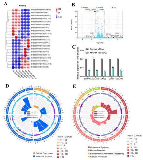 To identify the target genes of MAP4K4 in human SSCs, RNA sequencing of the human SSC line subjected to MAP4K4-siRNA2 or control-siRNA was performed. A total of 20,289 genes were sequenced. DEGs were selected based upon p < 0.05 and fold change ≥ 2 thresholds. The heat map and volcano plot shown in Figure 6A,B demonstrate that 37 genes were unregulated and 37 genes were down-regulated by MAP4K4-siRNA2. Five genes, including SPARC, ADAM19, GNG2, GPX7, and COLA1, were randomly selected to verify the RNA sequencing data through RT-PCR (Figure 6C). GO analysis showed that MAP4K4 affected biological processes, including cellular processes, metabolic processes, and biological regulation, as well as regulating molecular functions, e.g., binding, catalytic activity, and transcription regulator activity. In addition, KEGG analysis revealed significant differences in protein digestion and absorption and relaxin signaling pathways after MAP4K4 silencing. Among the top ten downregulated genes, SPARC and GNG2 mediated biological processes and pathways associated with cell proliferation and apoptosis, respectively (Figure 6D,E).