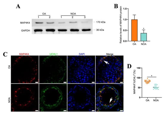 The expression of MAP4K4 in OA and NOA patients. (A,B) Western blotting showed the levels of MAP4K4 protein between OA and NOA patients. (C,D) The percentages of UCHL-positive cells expressing MAP4K4 (arrows) in OA and NOA patients. Scale bars in C: 100 μm. * indicates p < 0.05.