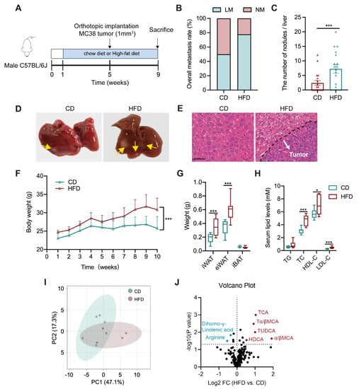 Altered circulating bile acid profile is associated with liver metastasis in an orthotopic implantation mouse model. (A) The timeline of the animal experiment (n = 18/groups); (B) The rate of liver metastasis; (C) The number of metastatic nodules in the liver; (D) Representative graphs of the gross liver (tumor nodule was labeled with yellow arrow); (E) Representative H&E staining images of mouse liver tissue (White arrow: metastatic tumor nodule; Scale bar = 50 μm); (F) The weekly body weight during the entire experiment; (G) The weights of inguinal white adipose tissue (iWAT), epididymal white adipose tissue (eWAT) and interscapular brown adipose tissue (iBAT); (H) Serum levels of triglycerides (TG), total cholesterol (TC), high-density lipoprotein cholesterol (HDL–C), and low-density lipoprotein cholesterol (LDL–C); (I) The PCA plot of serum metabolomes between CD and HFD groups (n = 5/groups); (J) The volcano plot of differential serum metabolites between both groups; The comparisons of each index between CD and HFD groups were conducted with an unpaired Students’ t-test, significance was presented as *, p < 0.05; ***, p < 0.005. Abbreviation: CD, chow diet; HFD, high-fat diet; NM, non-metastasis; LM, liver metastasis; H&E, hematoxylin and eosin; iWAT, inguinal white adipose tissue; eWAT, epididymal white adipose tissue; iBAT, interscapular brown adipose tissue; TG, triglycerides; TC, total cholesterol; LDL–C, low-density lipoprotein cholesterol; HDL–C, high-density lipoprotein cholesterol; PCA, Principal Component Analysis; TCA, taurocholic acid; TDCA, taurodeoxycholic acid; Tα/βMCA, tauro–α/β–muricholic acid, TUDCA, tauroursodeoxycholic acid; α/βMCA, α/β–muricholic acid; HDCA, hyodeoxycholic acid.