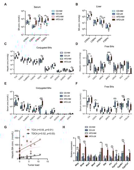 Dysregulated hepatic BA metabolism is strongly associated with liver metastasis in models fed with CD and HFD. (A,B) The liver and serum BA profiles among LM and NM models from CD and HFD groups (n = 9/group, 4 NM and 5 LM); (C,D) Concentrations of conjugated and free BA species in mouse liver; (E,F) Concentrations of conjugated and free BA species in mouse serum. (G) Pearson’s correlation between concentrations of BAs and tumor load in the liver. (H) The relative mRNA expressions of regulators to hepatic BA transport, synthesis, and signaling. Comparisons of BA–related indices among CD or HFD–fed NM and LM groups were determined with a two-way ANOVA test, significance was shown as *, p < 0.05; **, p < 0.01; ***, p < 0.005. Abbreviation: BA, bile acids; CD/HFD–NM, CD or HFD–fed mice without metastasis; CD/HFD–LM, CD or HFD–fed mice with liver metastasis; CPBAs, conjugated primary BAs; CSBAs, conjugated secondary BAs; FPBAs, free primary BAs; FSBAs, free secondary BAs; TCA, taurocholic acid; TCDCA, taurochenodeoxycholic acid; Tα/βMCA, tauro–α/β–muricholic acid; TUDCA, tauro–ursodeoxycholic acid; TDCA, taurodeoxycholic acid; TLCA, taurolithocholic acid; GCA, glycol–cholic acid; GCDCA, glycochenodeoxycholic acid; GUDCA, glycoursodoexycholic acid; GDCA, glycodeoxycholic acid; CA, cholic acid; CDCA, chenodeoxycholic acid; MCA, muricholic acid; UDCA, ursodeoxycholic acid; DCA, deoxycholic acid; 7–KLCA, 7–ketolithocholic acid; Ntcp, transporter Na+–taurocholate cotransporting polypeptide; Bsep, bile salt export pump; Mrp3, ATP–binding cassette transporter 3; Mrp4, ATP–binding cassette transporter 4; Oatp1, organic anion transporting polypeptide; Shp, small heterodimer partner; Fxr, farnesoid X receptor; Cyp7a1, cytochrome P450 7A1; Cyp8b1, cytochrome P450 8B1; Cyp27a1, Cytochrome P450 Family 27 Subfamily A Member 1.