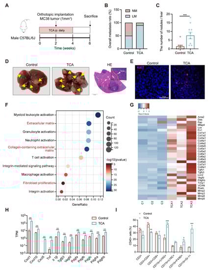 TCA promotes liver metastasis and induces tumor metastatic niche formation in the orthotopic implantation model. (A) Timeline of the animal experimental design (n = 10/groups); (B) The rate of liver metastasis; (C) The number of metastatic nodules in the liver; (D) Representative gross graphs and H&E staining of the liver (White arrow: metastatic tumor nodule; Scale bar = 2 mm (bottom) or 100 μm (top)); (E) Immunofluorescence (IF) staining of Ki67 in mouse liver sections (Purple represents Ki67, Bule represents DAPI; Scale bar = 50 μm). (F) The bubble plot of GO analysis of hepatic RNA–seq data between models treated with PBS and TCA (n = 3/groups); (G) The heatmap of differentially expressed genes related to the activation of fibroblasts between the control and TCA groups (red represents upregulation and blue means downregulation); (H) Transcripts per million (TPM) values of myofibroblasts-related chemokines and cytokines; (I) Flow cytometry-based counting of hepatic CD45+ immune cells, including CD11b+ Gr–1+ myeloid-derived suppressor cells (MDSCs), CD11b+ Ly6G+ granulocytes, CD11b+ Ly6C+ monocytes, and CD11b+ F4/80+ macrophages, CD3+, CD4+ and CD8+ T cells, (n = 3/groups). The statistic of liver metastatic nodules was analyzed with an unpaired students’ t-test, RNA–seq data comparison between the control and TCA groups was used with the FDR approach, the adjusted P Value of less than 0.5 was considered to differ significantly. Count data from IF or flow cytometry between both groups using unpaired students’ t-test, significance was presented by *, p < 0.05; ** p < 0.01; ***, p < 0.005. and significance was expressed by ***, p < 0.005. Abbreviation: IP, intraperitoneal injection; NM, non-metastasis; LM, liver metastasis; GO, gene ontology; TPM, transcripts per million.