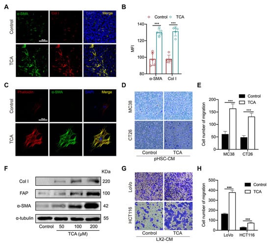 TCA–activated hepatic stellate cells enhance the migrative ability of CRC cells. (A,B) The IF staining of alpha–smooth muscle actin (αSMA) and collagen I (Col I) in mouse liver sections (Green represent αSMA; Red represents Col I, Bule represents DAPI; Scale bar = 50 μm), the data was calculated by the mean fluorescence intensity (MFI) (n = 5/groups); (C) The IF staining of αSMA and phalloidin in primary HSCs (pHSCs) treated with TCA (Green represents αSMA; Red represents phalloidin, Bule represents DAPI; Scale bar = 50 μm); (D,E) The effects of conditioned medium from DMSO or TCA–treated pHSCs on the migration of murine cell lines MC38 and CT26 resulted from the transwell assay; (F) Protein expressions of activated HSCs markers αSMA, Col I, and fibroblast activation protein (FAP) in LX2 cells treated with 50, 100, and 200 μM of TCA; (G,H) The effects of conditioned medium of DMSO or TCA–treated LX2 cells on the migration of human cell lines HCT116 and LoVo resulted from the transwell assay. Comparison between the control and TCA groups was determined using unpaired students’ t-test, significance was expressed by ***, p < 0.005. Abbreviation: αSMA, alpha–smooth muscle actin; Col I, collagen I; MFI, mean fluorescence intensity; pHSC–CM, the conditioned medium of primary HSCs; αSMA, alpha–smooth muscle actin; FAP, fibroblast activation protein; LX2–CM, the conditioned medium of LX2 cells.