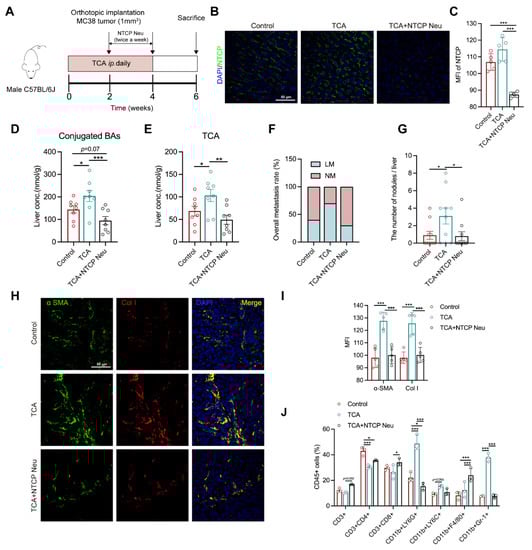 NTCP neutralization can inhibit TCA–induced liver metastasis and the tumor-favorable microenvironment. (A) Timeline of the animal experiment (n = 10/groups), Na+–taurocholate cotransporting polypeptide neutralizing antibody (NTCP Neu) was IP injected to models (20 μg/mice) twice a week for 2 weeks; (B,C) The IF staining of NTCP in mouse liver sections (Green represents NTCP, Blue represents DAPI; Scale bar = 50 μm) and the MFI values of NTCP among groups (n = 5/groups). (D,E) The levels of conjugated BAs and TCA in mouse liver (n = 8/groups); (F) The rate of liver metastasis; (G) The number of liver metastasis nodules; (H,I) The IF staining of αSMA and Col I in the mouse liver sections (n = 5/groups) (Green represents αSMA; Red represents Col I; Bule represents DAPI; Scale bar = 50 μm), the data was calculated by the MFI; (J) Flow cytometric analysis of hepatic CD45+ immune cells, including CD11b+ Gr–1+ myeloid-derived suppressor cells (MDSCs), CD11b+ Ly6G+granulocytes, CD11b+ Ly6C+ monocytes, CD11b+ F4/80+ macrophage, CD3+, CD4+ and CD8+ T cells (n = 3/groups); The phenotype of the tumors, BAs, fibroblasts, and immune cells were compared among groups using the one-way ANOVA method, significant difference was shown as *, p < 0.05; **, p < 0.01; ***, p < 0.005. Abbreviation: IP, intraperitoneal injection; NTCP Neu, Na+–taurocholate cotransporting polypeptide neutralizing antibody; NM, non-metastasis; LM, liver metastasis; αSMA, alpha–smooth muscle actin; Col I, collagen I; MFI, mean fluorescence intensity.
