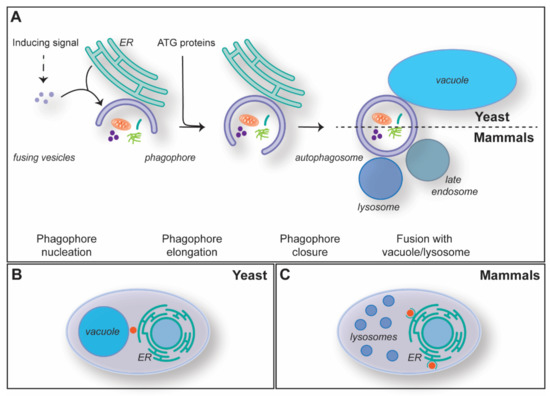 Complete autophagosomes undergo a maturation step that is characterized by the hydrolysis of PtdIns3P into PtdIns by Ymr1 in yeast, MTM-3 in Caenorhabditis elegans and MTMR8 in mammals—all members of the myotubularin phosphatase family—and the release of the ATG proteins from their surface [19,20,34,43,44,45]. While in yeast they fuse directly with the vacuolar membrane (Figure 2A), autophagosomes are transported via microtubules to the microtubule-organizing centers (MTOCs), where late endosomes and lysosomes are concentrated [42,46]. These autophagosomes fuse first with late endosomes and then lysosomes, or directly with lysosomes (Figure 2A), to form amphisomes and autolysosomes [47]. Fusion is mediated by SNARE proteins and requires prior tethering, an event that involves the small GTPase RAB7, its guanosine exchange factor and the homotypic fusion and protein sorting (HOPS) complex [41,47,48]. Finally, upon fusion, the inner membrane of the autophagosomal vesicle and its cargo are degraded by vacuolar/lysosomal hydrolases and the resulting metabolites transported into the cytosol to be used as a source of energy or building blocks for the biosynthesis of macromolecules [22]. As it will be discussed in the subsequent section, membrane supply for the biogenesis and subsequent expansion of phagophores requires, amongst other factors, MCSs between the phagophore and multiple intracellular organelles, including ER, and possibly mitochondria and lipid droplets (LDs).
