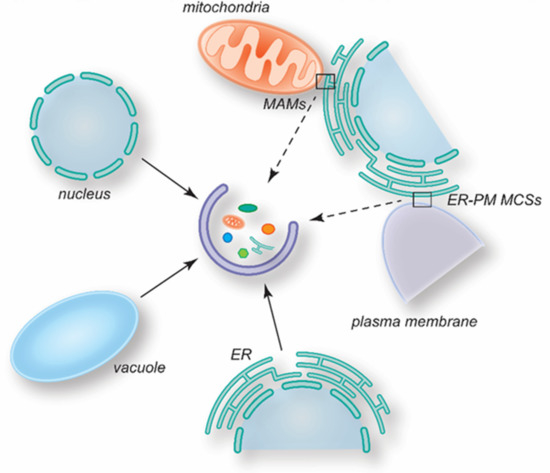 MCSs are ubiquitous and are often established between multiple organelles [9]. Therefore, rather than looking at organelles as separated entities, they must be seen as components of a vast spatiotemporally regulated network, composed of all the intracellular compartments and the PM, which exert their functions in an orchestrated and coordinated manner. Metabolic channeling is a key function of MCSs. The process has been implicated in calcium exchange, and MCSs of the ER—along with other organelles, such as mitochondria, PM and Golgi—are involved in lipid biosynthesis and exchange, and consequently, also organelle biosynthesis [2,10]. Lipid biosynthesis and exchange via MCSs also play a pivotal role during macroautophagy.
