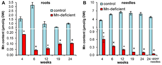 The Mn content in the organs of Scots pine seedlings: roots (A); and needles (B). The mean values ± SEs are given (n = 6). Asterisks (*, for Student’s t test) or multiplication signs (×, for Mann–Whitney rank sum test) denote significant differences at p < 0.05 between control and Mn-deficient plants at each separate time point.