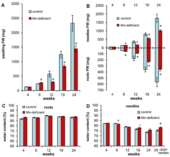 The fresh weight (A,B) and water content (C,D) in the organs of Scots pine seedlings during the experiment. Asterisks (*, for Student’s t test) or multiplication signs (×, for Mann–Whitney rank sum test) denote significant differences at p < 0.05 between control and Mn-deficient plants at each separate time point.