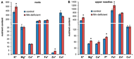 The contents of nutrients in the organs of Scots pine seedlings at the 24th week of the experiment: roots (A); upper needles (B). The mean values ± SEs are given (n = 6). The mean element contents in µmol/g DW (#) or nmol/g DW (§). Asterisks (*, for Student’s t test) or multiplication signs (×, for Mann–Whitney rank sum test) denote significant differences at p < 0.05 between control and Mn-deficient plants.