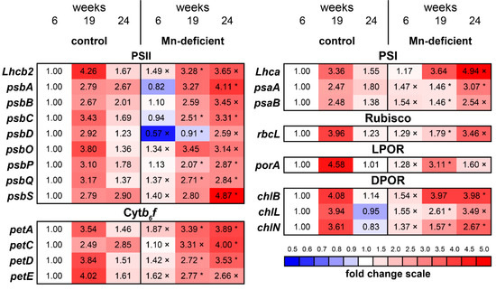 The transcript levels of photosynthetic genes (Lhcb2, psbA, psbB, psbC, psbD, psbO, psbP, psbQ, psbS, petA, petC, petD, petE, Lhca, psaA, psaB and rbcL) and genes involved in chlorophyll biosynthesis (porA, chlB, chlL, chlN) in the needles of Scots pine seedlings. Asterisks (*, for Student’s t test) or multiplication signs (×, for Mann–Whitney rank sum test) denote significant differences at p < 0.05 between control and Mn-deficient plants at each separate time point.