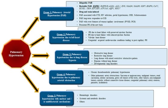 Pulmonary hypertension can be classified into five different groups [] based on the most probable etiology, co-morbid conditions, and hemodynamic parameters (Figure 1), the Group I, or pulmonary arterial hypertension (PAH), that includes the “familial” or hereditary forms of PAH (HPAH); Group II or pulmonary venous hypertension due to left heart disease; Group III or pulmonary hypertension due to lung diseases and/or hypoxia; Group IV or pulmonary hypertension due to chronic thromboembolic disease; and Group V PH with unclear and/or multifactorial mechanisms [].