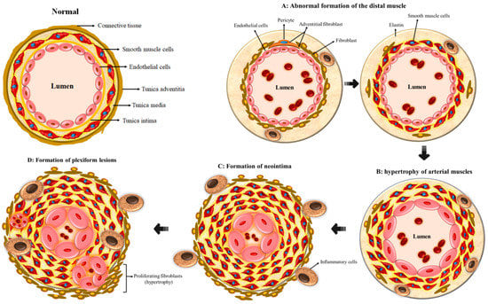 One of the pathognomonic features of PAH is the appearance of smooth muscle cells in the small outermost pulmonary arteries, usually within the non-muscular respiratory acinus (Figure 2A). The cellular mechanisms behind this remodeling are neither fully elucidated nor understood. Preclinical models have shown that fibroblasts from the adventitia are activated following a hypoxic trigger, leading to their proliferation and subsequent migration to the medial and intimal layers. These fibroblasts further differentiate into smooth muscle-like cells that gradually propagate and generate matrix proteins that deposit along the arterial walls []. In carriers of the BMP mutation or other forms of inherited PAH, this insult is presumed to trigger hypertrophy of the arterial walls (Figure 2B), followed by the development of neointima (Figure 2C) and accumulation of myofibroblasts and extracellular matrix between the endothelium and the inner elastic lamina as well as neovascularization. In addition, upregulation of matrix metalloproteinases (MMP-1 and MMP-9) has been observed and appears to promote migration of the adventitial fibroblasts [].