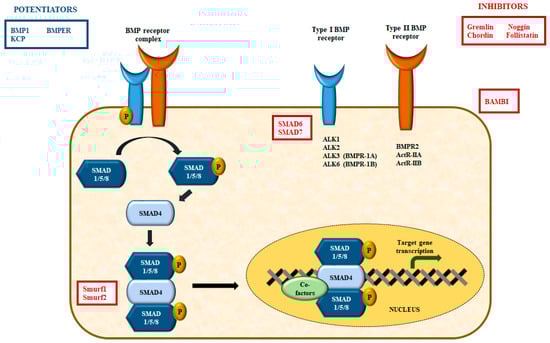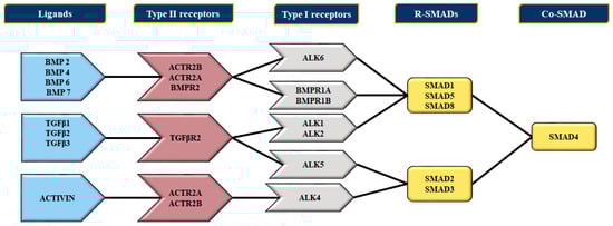 The BMP2/4 interacts with ALK3 and ALK6 to establish an active receptor complex [,]. On the other hand, the BMP6/7 binds to ActR-IIA along with ALK2 and ALK3 [,,], while BMP9/10 binds to BMPR2 together with ALK1/2 [,] and signals through ActR-IIA or endoglin, a co-receptor that encodes for the TGF-β/BMP signaling pathway [] (Figure 3). The type II receptors, after binding with the BMP ligand, phosphorylates and thereupon activates the type I receptors, which sequentially phosphorylates the receptorreceptor-regulated SMADs such as SMADs 1, 5, and 8. The BMP-specific R-SMADs form a complex along with SMAD4, which translocate to the nucleus, where it associates with the transcriptional co-activators like p300, CBP, Runx2, and GCN5 or co-repressors like c-Ski, SnoN, Tob, and SIP1 [,,], resulting in the activation or inhibition of gene transcription. Conversely, the TGF-β ligands signals through SMAD2 and 3, but also through ALK1 and 2, which further promotes the activation of SMAD 1 and 5 in endothelial and other cells [,].