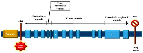 Diagrammatic representation of BMPR2 gene. The BMPR2 gene comprises of 13 exons that encodes the extracellular ligand-binding domain (exons 1 to 3), transmembrane membrane domain, (exons 4 to 5), kinase domain (exons 6 to 11), and the C-terminal tail domain (exons 12 to 13).