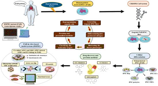 The limited availability of human tissues that can only be obtained from patients with end-stage PAH has hindered the current understanding of PAH disease development and progression. Moreover, animal models do not accurately reflect human disease conditions due to specific discrepancies (species) and distinct pathogenic mechanisms that generally fail to recapitulate the complex pathogenesis of subjects with pulmonary hypertension. For example, the characteristic dysfunction of PAECs in PAH has been demonstrated in cultured cells and animal models of PH. Nevertheless, the type and severity of PAEC dysfunction, aberrations in gene expression, and the response to specific treatment regimen may differ from person to person (personalized medicine). In addition, there is limited availability of patient-specific PAEC to investigate the onset of PAH. Most importantly, the present existing animal models of PH only reproduce some but not all features of the human pathology. As such, new alternative models are required to gain a better understanding of the underlying molecular mechanisms of disease initiation and progression and for the development of new targeted treatments. Induced pluripotent stem cells (iPSCs) have been utilized to model several human cardiovascular diseases, including PAH [,,,]. Recently, we have witnessed an increasing interest in using this tool due to the ability of the iPSCs to differentiate into all somatic cell lineages, facilitated by genome editing tools and model systems. The evidence supporting the usage of stem cells to model PAH is presented below.