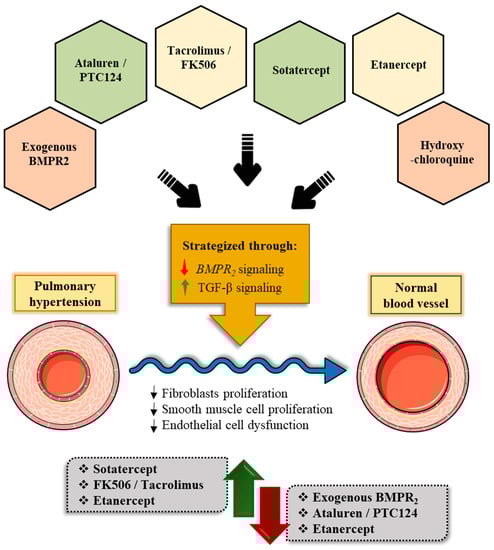 Presently, there are fourteen drugs that have been approved by the Food and Drug Administration (FDA) in the United States for the treatment of PAH and chronic thromboembolic pulmonary hypertension (CTEPH). Nonetheless, the mortality rate remains high, and there are no treatments that have shown to halt disease progression. As a result, there is an unfulfilled need for newer treatments that go beyond pulmonary vasodilation and target therapeutic remodeling. The potential novel therapeutic regimen that targets via the BMPR2 are discussed below.